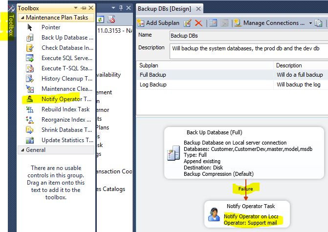 Here we add a Notify Operator Task to the maintenance subplan that will execute if the job failed or succeed. I always add to send a notification when the job fails but for testing purposes I add a notification if the job succeeds just to see if the notification works.