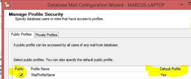 Before we can send mail from SQL we have to set up the mail configuration. Create a mail profile and then add an account. Set the profile to be public a default.