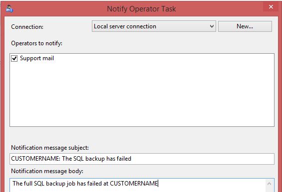 Modify your Backup DBs maintenance plan and choose the first subplan. Drag and drop an Operator task to the subplan and connect them with a failure action.