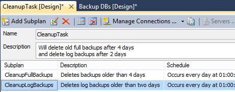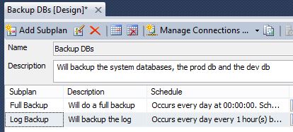 Now we have a maintenance plan named Backup DBs that contain two subplans, one for creating full backups and one for creating log backups.
