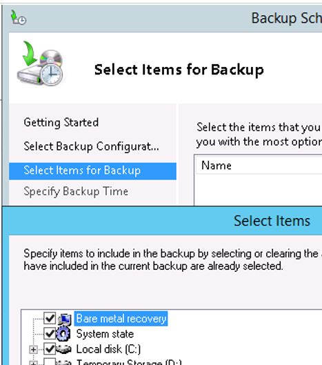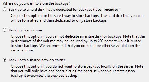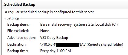 So which settings am I using? I got two servers, one SQL server and one NAV server. I choose to back up the bare metal recovery, system state and the OS disk. After that I choose to back up to a shared network folder. The reason for that is that I only want one backup at a time. Why you might wonder. I think it is always good to have several old backups but instead of having several backups locally I will later set up an Azure backup that will send my daily server backups to the cloud. So in the end I will have several day-backups that I can restore from.