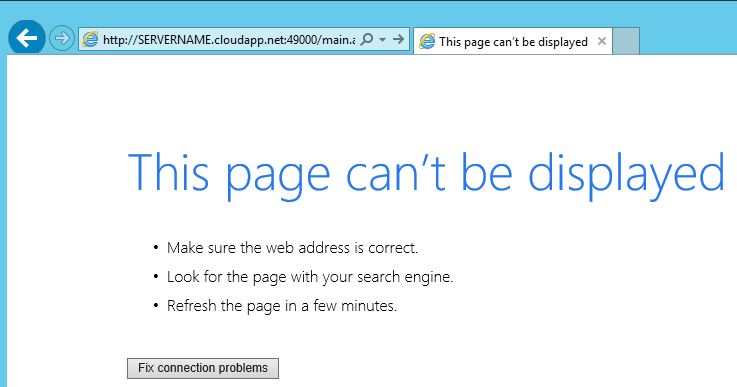 I try to change the local address http://SERVERNAME:49000/main.aspx… to  http://SERVERNAME.cloudapp.net:49000/main.aspx…  and what happens? We get “This page can’t be displayed”.