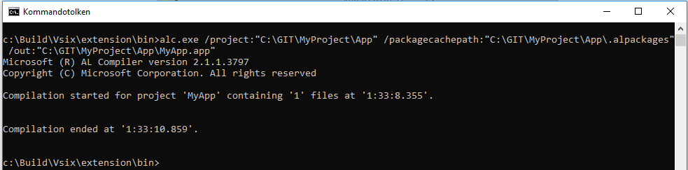 alc.exe /project:"C:\GIT\MyProject\App" /packagecachepath:"C:\GIT\MyProject\App\.alpackages" /out:"C:\GIT\MyProject\App\MyApp.app"