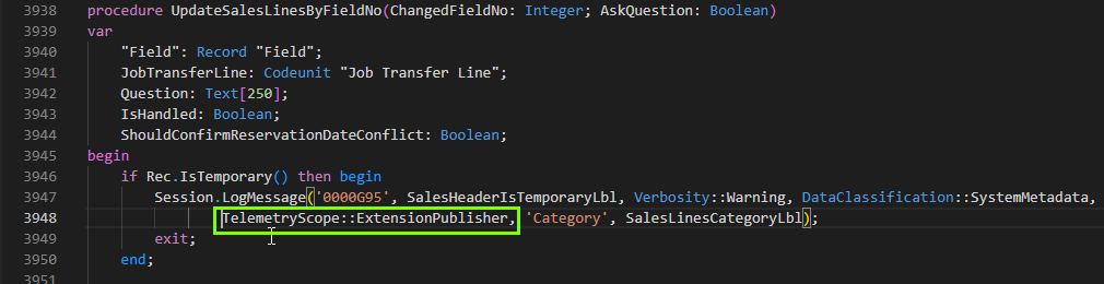 Why is that? Well if we lookup the command session.logmessage we can see that if it has TelemetryScope::Extensionpublisher which means that it will only be sent to the publisher of the app which in this case is Microsoft. This explains why it is not shown in our telemetry.
