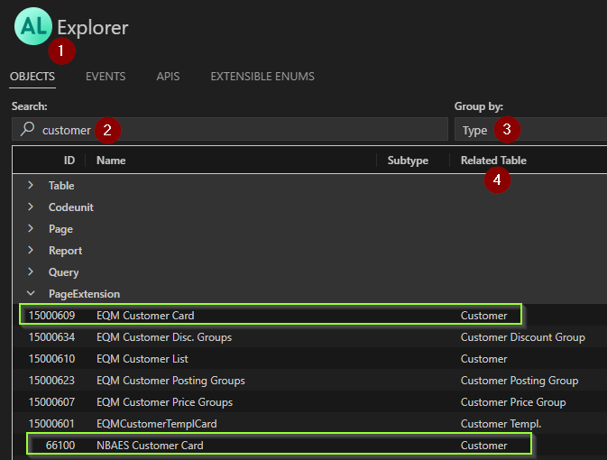 Then write the table name you want to filter on in the search filed (2) and pick that it should group by type (3). Then look at the PageExtension group in combination with related table to see which pageextension that extends the table (4). If you are lucky the naming of the extension object gives away that it extens your object of interest.