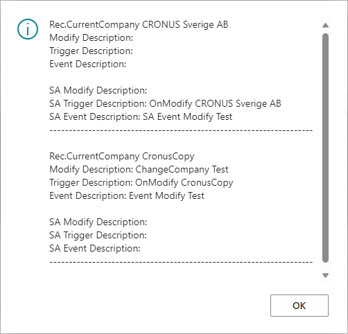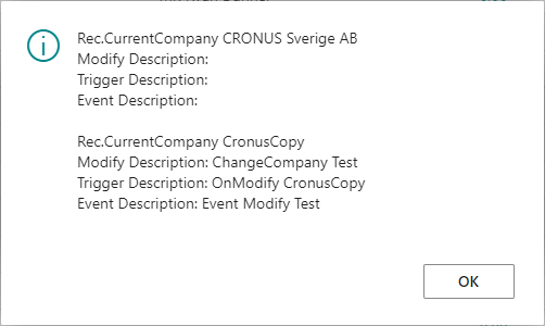 The idea with this table is we should create two records, one in each company. Then we call the rec.ChangeCompany, do a modification, and run modify(true) on that record. And on top of that we have an eventsubscriber on the table that listens to modificatio on the same table. Then we can see what get changed where.